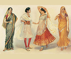 The ancient stone inscription from Gangaikonda Cholapuram in old Tamil scripts has a reference to hand weaving.[12] In ancient Indian tradition and the Natya Shastra (an ancient Indian treatise describing ancient dance and costumes), the navel of the Supreme Being is considered to be the source of life and creativity, hence the midriff is to be left bare by the sari.